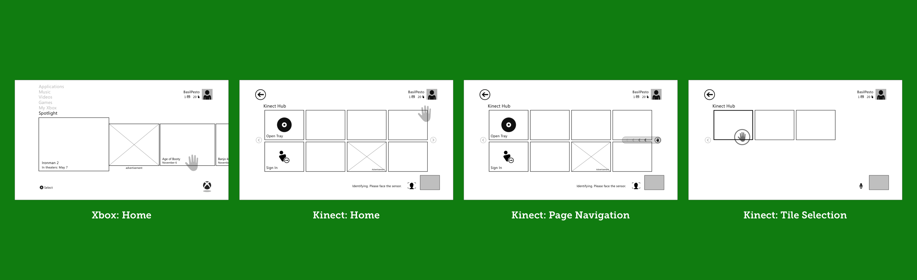 As shown above, on the left, we were looking to incorporate selection, swipe, and scroll to the components and card templates. UX Research and Engineering found that the sensors in the camera weren’t able to allow stable control of the UI through this model. With the expected announcement at E3 in June, we finalized the separate tile-based UX shown above on the right. Designing Kinect interface buttons to be larger resulted in greater performance with hand-activated selections and successful customer navigation models.
