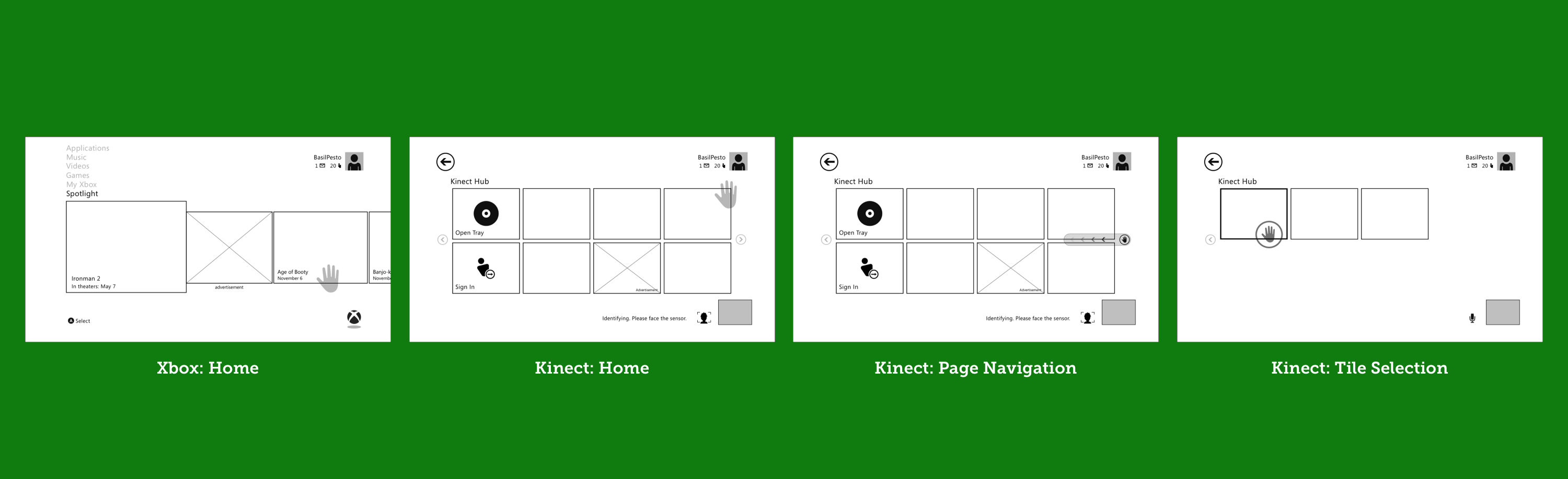 As shown above, on the left, we were looking to incorporate selection, swipe, and scroll to the components and card templates. UX Research and Engineering found that the sensors in the camera weren’t able to allow stable control of the UI through this model. With the expected announcement at E3 in June, we finalized the separate tile-based UX shown above on the right. Designing Kinect interface buttons to be larger resulted in greater performance with hand-activated selections and successful customer navigation models.